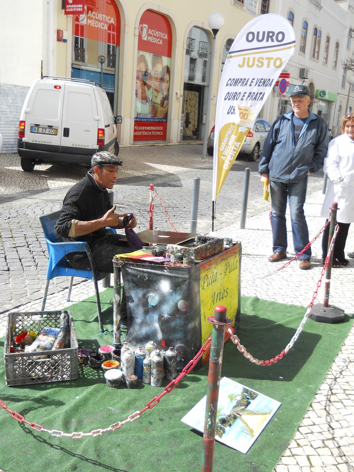 Calcorreando várias cidades de Portugal, o brasileiro Pula-Pula pinta com os dedos, alguns pincéis e também com filtros de cigarros que vai apanhando do chão!