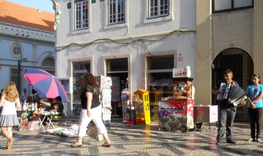 A livraria – A vendedora de pevides atrás do toldo – A vendedora participante em mais uma feira ‘vintage’ – O vendedor de pipocas – Os músicos ambulantes que atuaram muito bem – E as pessoas agradadas a passar.