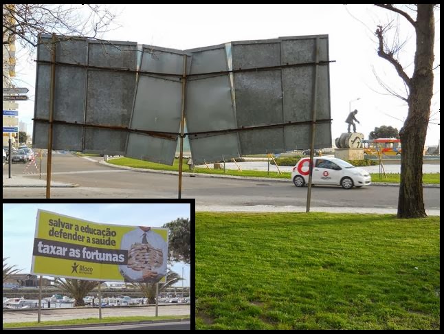 Dois grandes placardes estão aparentemente em queda desde aquelas ventanias de há cerca de duas semanas! Em Buarcos e na Figueira da Foz (foto pequena). Curiosamente ambos publicitando temas do mesmo partido político, o que não é para aqui chamado!