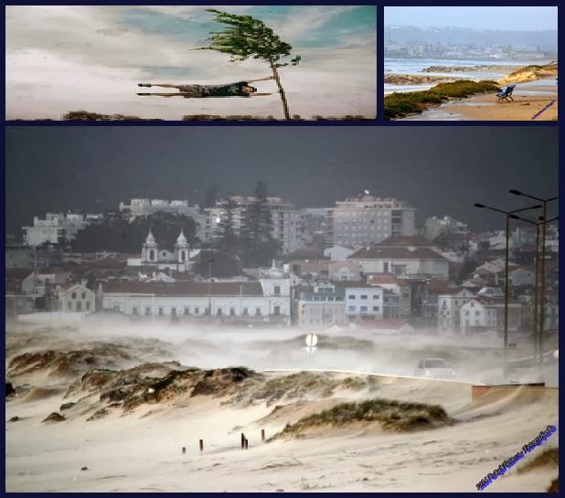As duas fotos seguintes foram tiradas a partir da Praia da Cova: a mais pequena mostra o passeio junto ao mar, e na foto central vê-se a tempestade de areia na povoação com a cidade por fundo, do outro lado do rio!