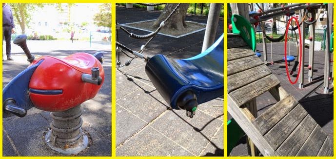 | Foto 1) Um 'equipamento' sem maçaneta; 2) Outro, preso só por uma amarra; 3) Uma 'rampa' sem uma tábua mas com 'farpas', e mais à frente assinalado em vermelho, um 'cabo 'solto'! |