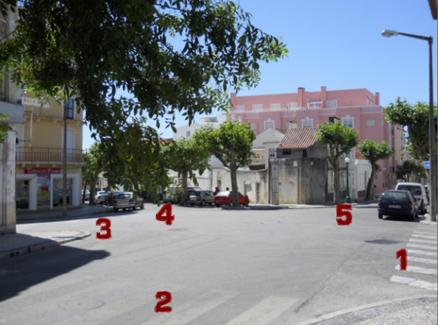 Neste conhecido e movimentado (por carros e por peões) cruzamento da cidade, verifica-se que a 1-Rua do Viso, 2-Rua Joaquim Sotto Mayor, 3-Rua dr. Luís Carriço, e 4-Rua da Fonte, têm passadeiras para peões. Mas não a 5-Rua da Liberdade