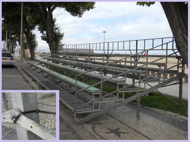 Isto porque é visível que, em vez de estar apertada com porcas adequadas para estruturas metálicas que, ainda por cima, podem comportar dezenas / centenas de pessoas, a dita bancada está segura por abraçadeiras de fivela, feitas de plástico ou borracha (imagem pequena inclusa).