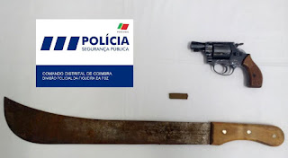 Perante anterior denúncia da vítima de sucessivas agressões físicas por parte do suspeito, foi efetuada ontem, pelas 17h00, uma busca domiciliária na Figueira da Foz, onde foi encontrado o seguinte material que foi apreendido: Uma catana com o comprimento total de 67 cm e 50 cm de lâmina, um revólver de calibre 9 mm, e um produto de cor castanha suspeito de ser haxixe.