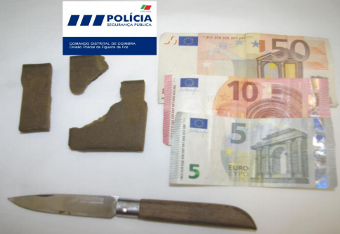 Foi encontrado na posse do indivíduo, residente na zona de Abrunheira, vários pedaços de um produto de cor castanha com as características de “haxixe” e que, após teste de despistagem para estupefaciente, foi confirmada a natureza do produto, tendo sido apreendido um total de 305 doses individuais de haxixe, uma determinada quantia em dinheiro (que se supõe ser proveniente da atividade ilícita) e uma navalha com vestígios do referido produto. (Compilação de Nota de Imprensa enviada pelo Comando Distrital de Coimbra da PSP)
