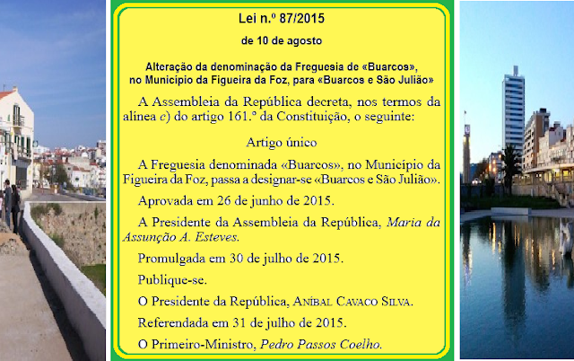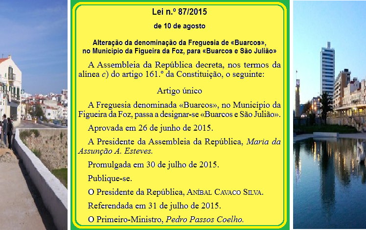 Foi hoje publicada a Lei n.º 87/2015, segundo a qual é alterada a denominação da Freguesia de «Buarcos», no Município da Figueira da Foz, para «Buarcos e São Julião».