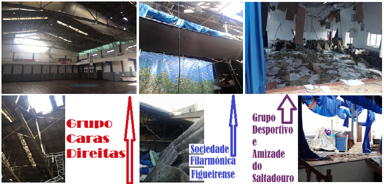 Mais uma vez a Sociedade Filarmónica Figueirense nascida em 1842 ficou sem telhado (C. Cachulo); Também o Clube Desportivo da Amizade do Saltadouro (Ana P. Rodrigues); O Pavilhão do Grupo Caras Direitas (Adriana Maia); e a zona dos balneários da Associação Naval 1893 (Marco Figueiredo)!