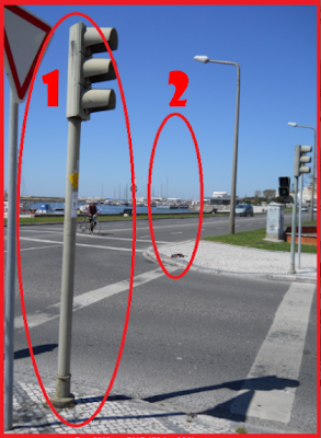 ADENDA: Um "anónimo" corrigiu o 2º parágrafo, informando-nos que os semáforos tinham um botão para os "abrir" para os peões. É pena o leitor o ter feito como anónimo pois gostaríamos de lhe agradecer a "dica", no entanto quando tirámos a foto, há três/quatro dias atrás, o botão estava desativado. Por sua vez ninguém sabe que o botão ali está, pois não se encontra sobre nenhum suporte saliente, mas sim "invisível" para quem procura. E depois não é funcional para quem vai de um lado ter de se deslocar uns bons 7 a 8 metros para o outro para carregar no botão, e depois regressar.